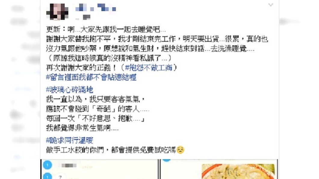 網友看了聊天記錄也大感不可思議,無法相信現在居然還有人的臉皮可以比犀牛皮還厚!大家都認為奧客根本無心要買水餃,「一看就知道是來鬧的吧!」、「永遠吃免錢的概念」、「我是嘉義人以他為恥,不要出去丟臉啦傻眼」!怎麼會有這樣的人啊?連拗免費試吃還可以如此理直氣壯,真的太欺負人了!希望他可以看到網友的反應,不要再這樣去鬧別人了!