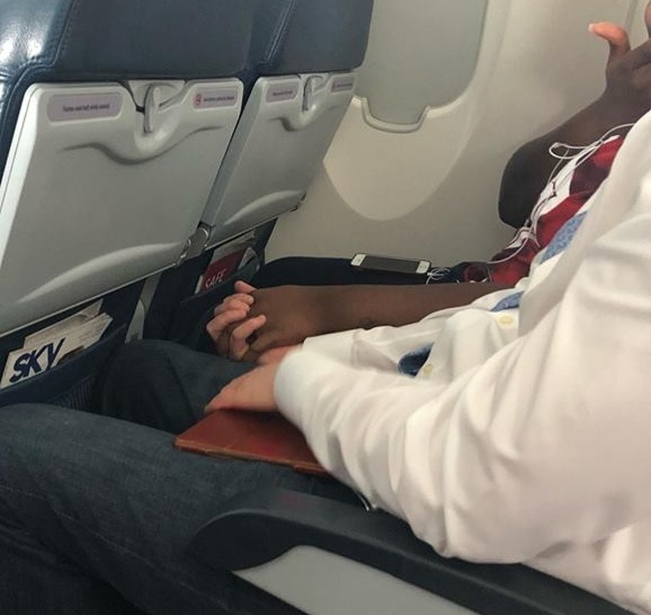 ▼這兩個人並不認識彼此,女生是第一次搭飛機,看得出她很緊張,隔壁的男子說話安慰她,並且握住她的手讓她安心。