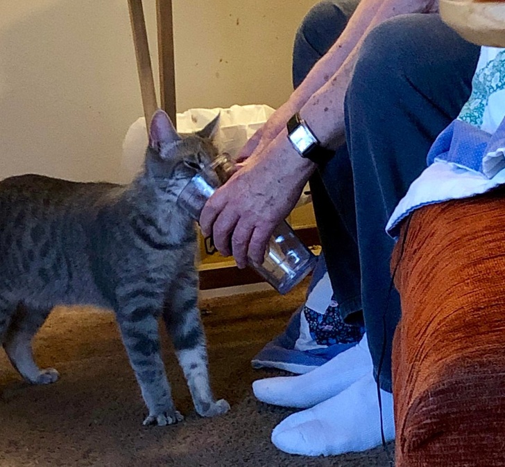 ▼我爸拯救回家的流浪貓並沒有正確的斷奶,也非常有個性,牠只有在我爸將杯子拿著時,才願意喝水。