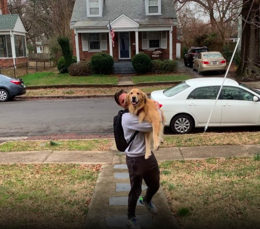 ▼那天Riley見主人回來,馬上推開門跑出去。牠狂搖尾巴,還一個彈跳撲到主人懷裡。Riley體型比較大,主人穩穩抱住牠,連退3步才停下。