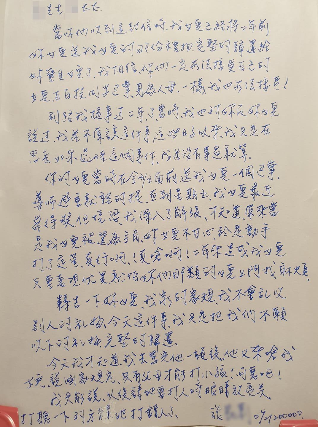▼張女把整個過程拍下來還PO網,引起網友熱議,還驚動了教育局。事後張女公開了一封手寫信,直言是給施暴女同學的家長,嗆對方「你女兒送的禮物,我原封不動的還給你!」