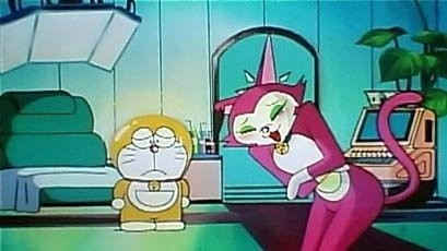 ▼1985年之前出生:黃色的「哆啦A夢」從鏡子中看到自己的耳朵被老鼠咬掉,大受打擊,又被刺激到,就變成了藍色;