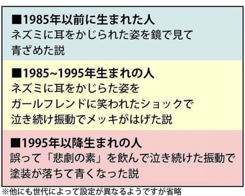 ▼1985年到1995年之間出生:「哆啦A夢」的耳朵被老鼠咬掉,沒有耳朵的樣子太奇怪了,被女友嘲笑。他難過到大哭,淚水把身上的黃漆洗掉,露出了原本的藍色。