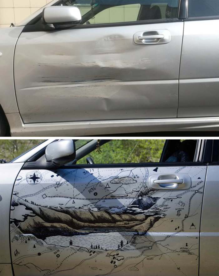 ▼雖然車子被撞凹,可是他用藝術來彌補了這些缺陷。