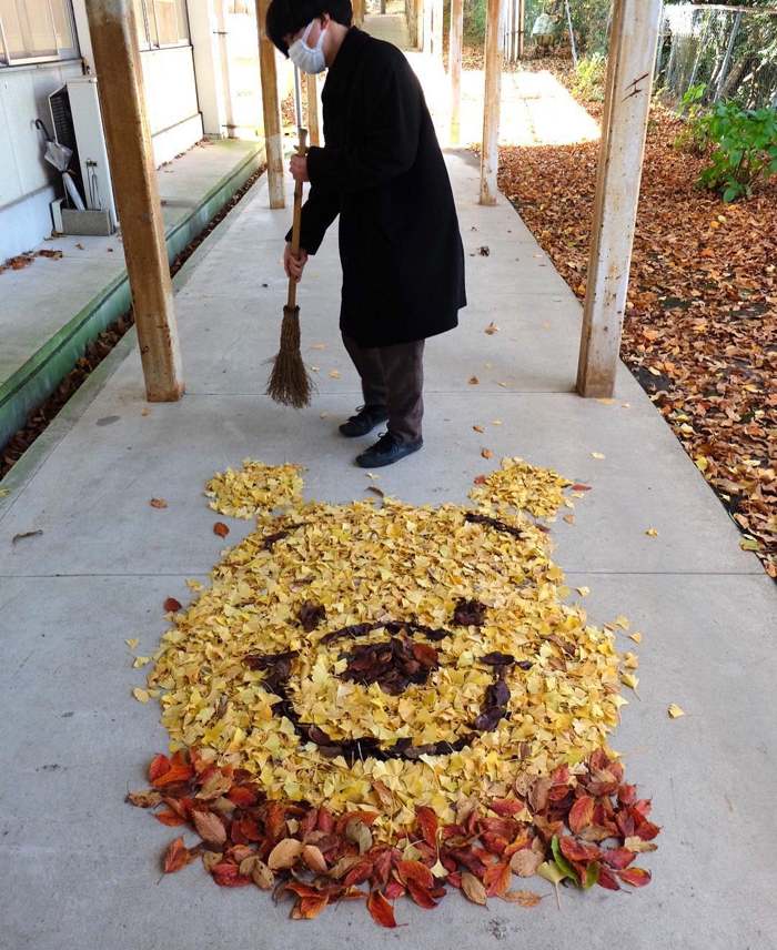 ▼他在掃落葉的同時,創作了一隻小熊維尼!