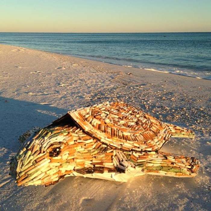▼一個小女孩在凈灘時,將撿到的香菸頭拍成了一隻海龜。