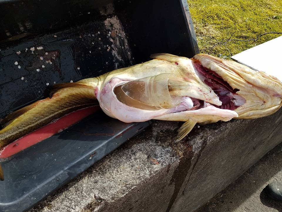 ▼挪威一名男子釣到了一隻腹部隆起的鱈魚,剖開後發現裡面是1.5公升的寶特瓶!