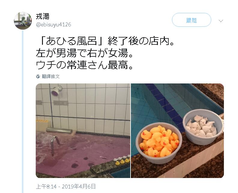 ▼日本大坂平野區一間名叫戎湯澡堂,在2019年4月6日推出了「鴨鴨浴」的活動。原本是一場普通的活動,沒想到竟因為男湯和女湯的不同結果,在網路上引發熱議。