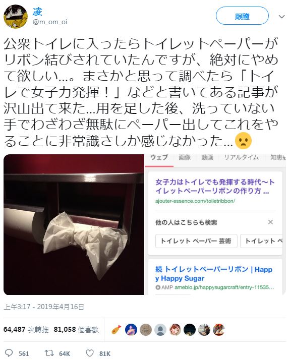 ▼一名網友就在個人推特上po文怒斥這樣的行為,表示「我在公共廁所發現衛生紙被人折成蝴蝶結,上網一查發現竟然有文章在教大家如何把衛生紙折成蝴蝶結來展示女子力,這樣沒洗手又浪費衛生紙真的太沒常識了」!