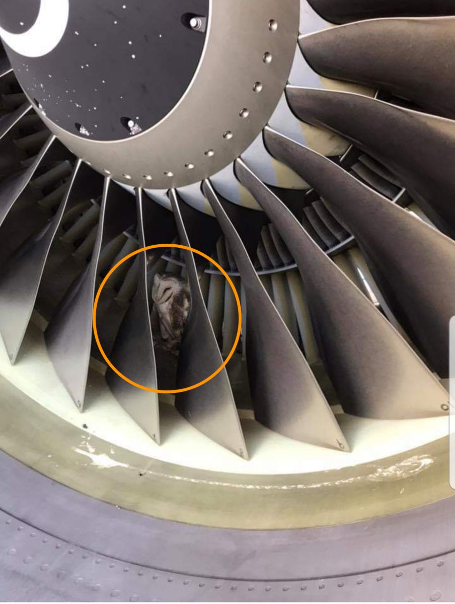 ▼如果沒發現這隻貓頭鷹就起飛,不只牠會命喪當場,也可能造成飛機引擎故障;事實上過去也曾有飛機因「鳥擊(bird strikes)」而發生事故,非常危險。幸好有機務人員及工程師的細心檢查,也說明了飛機起飛前例行檢查的重要性。