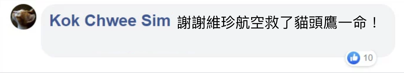 ▼網友們看到這篇貼文也紛紛推文、感謝維珍航空救了這隻小貓頭鷹。