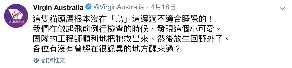 2019年04月22日每一班飛機一起飛,上面載的就是動輒數百、數千條人命,也因此起飛前的保養及檢查就特別重要,有許多繁複的流程來保障大家的安全。日前「澳洲維珍航空(Virgin Australia)」在為一架波音737做起飛前的例行檢查時,竟然發現引擎裡有一隻貓頭鷹在大爆睡!事發後官方將這則消息發上推特,引來網友大讚:感謝你們有好好檢查!