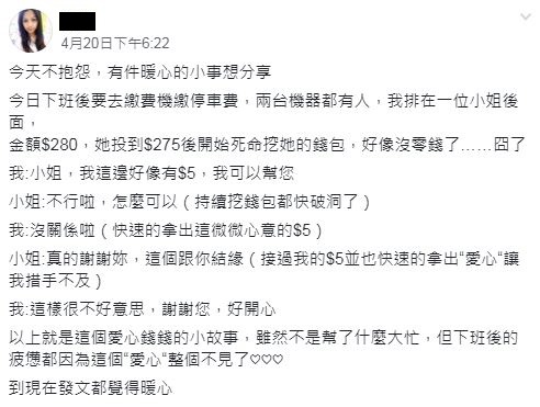 2019年04月23日無論是大事小事,能夠幫助別人都是一件非常值得開心的事。一名女網友就在臉書社團《爆怨公社》中po文表示,自己日前在停車場排隊繳費時,看到前方一名女子似乎零錢不夠,於是拿出了5元幫對方完成付款。結果她竟然收到了對方給她的「結緣回禮」,讓她「下班後的疲憊都因為這個『愛心』整個不見了!」