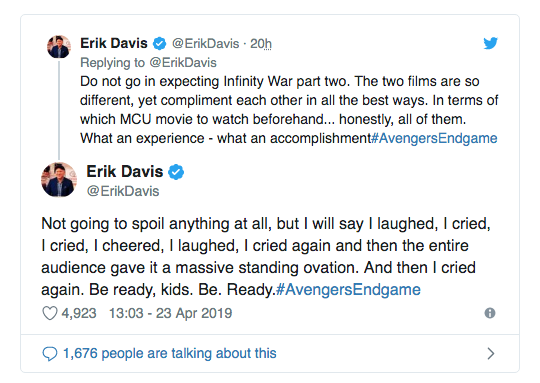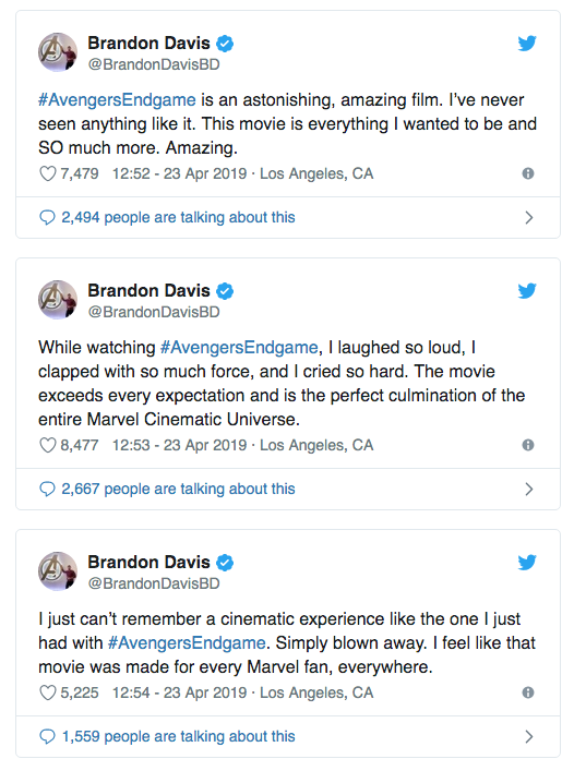 「《終局之戰》太猛了!神片!我出生到現在從沒看過這樣子的電影,這部電影比你能想像的更完美。我笑超大聲、超用力拍手、然後哭超慘!這部電影真的是漫威最厲害的電影!這部電影就是拍給漫威粉絲看的,而且是全世界的漫威粉絲。」
