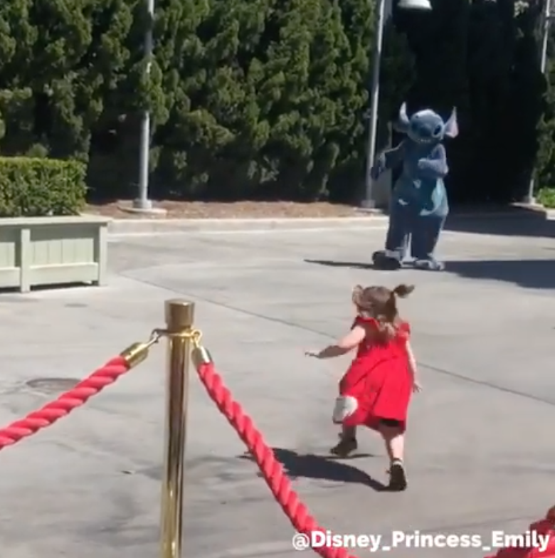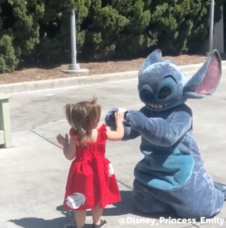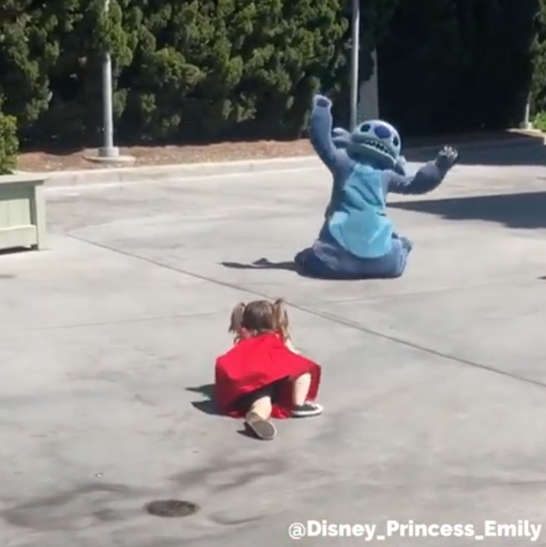 2019年04月25日外國一名小女孩Emily來到迪士尼非常興奮,尤其是看到偶像史迪奇出現的時候更是飛奔衝過去要擁抱,然而她卻一個不小心跌了一跤,正在錄影的媽媽原本以為她會大哭,沒想到史迪奇機智地用一個動作化解尷尬,成功轉移小妹妹的注意力!