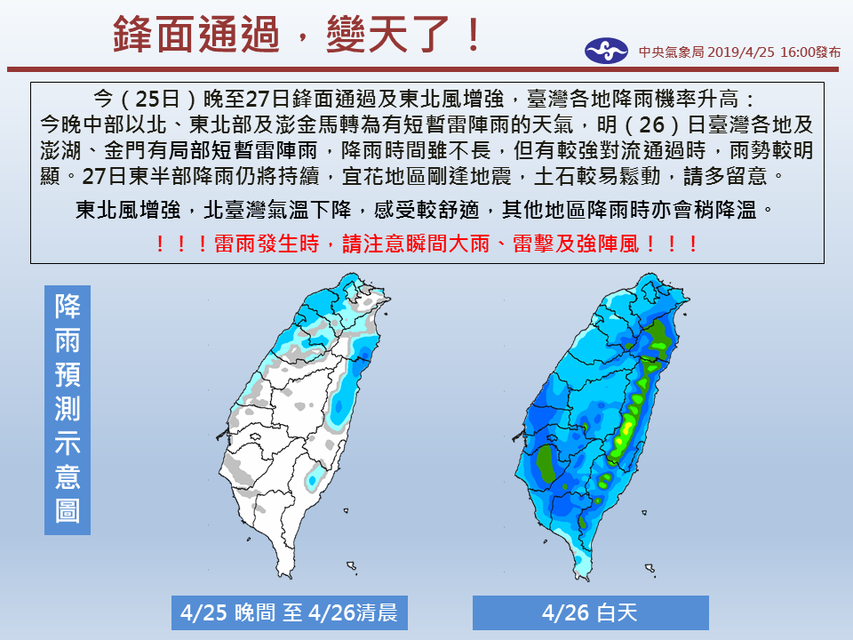 2019年04月26日氣象局的臉書粉絲專頁「報天氣-中央氣象局」在4月25日發布了即將變天的消息,指出24日至27日將有鋒面通過,加上東北風增強,台灣各地降雨的機率都大大提高,中部以北、東北部及澎金馬將轉為有短暫雷陣雨的天氣,其他地區及澎湖、金門也有局部短暫雷陣雨。