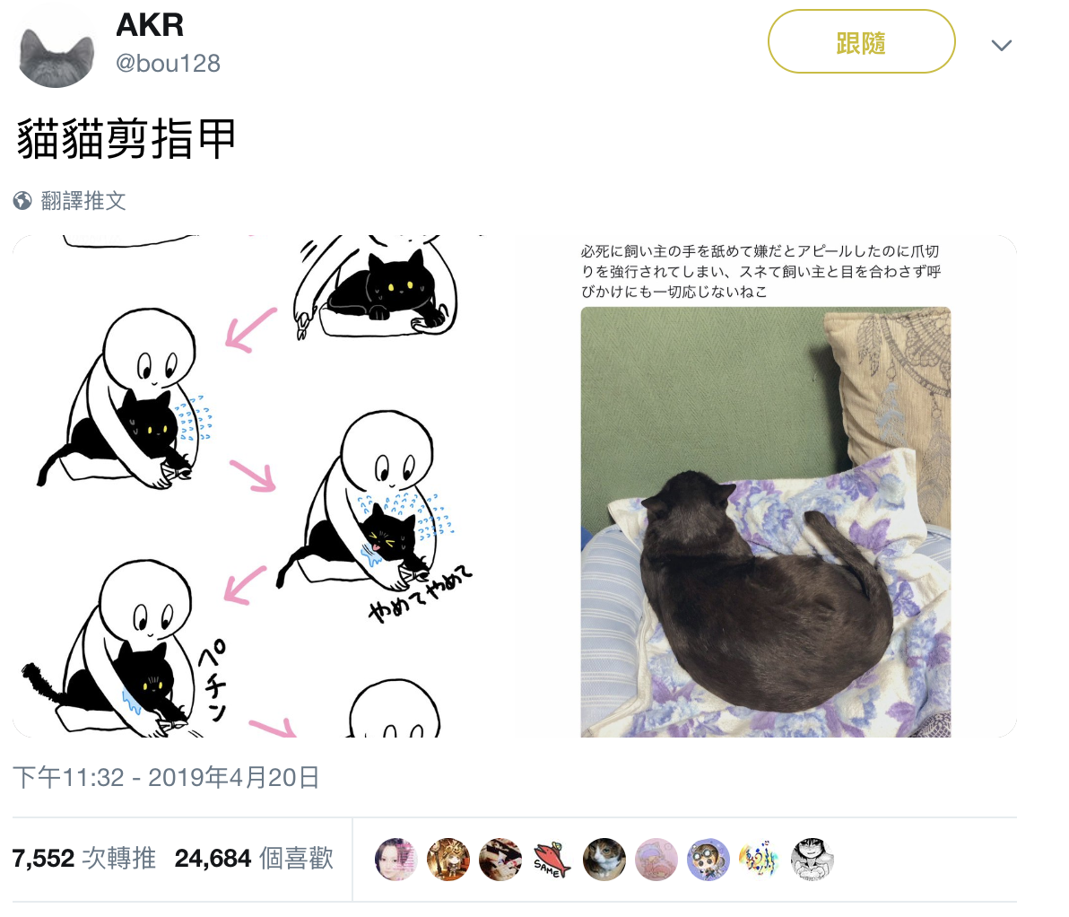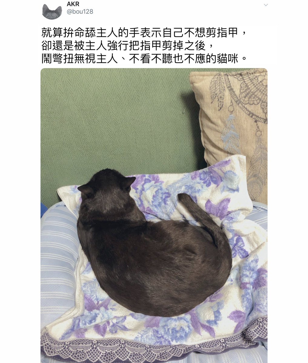 ▼推主「AKR(bou128)」在推特上po出他家貓貓剪指甲時的狀態,引來許多貓奴網友討論。