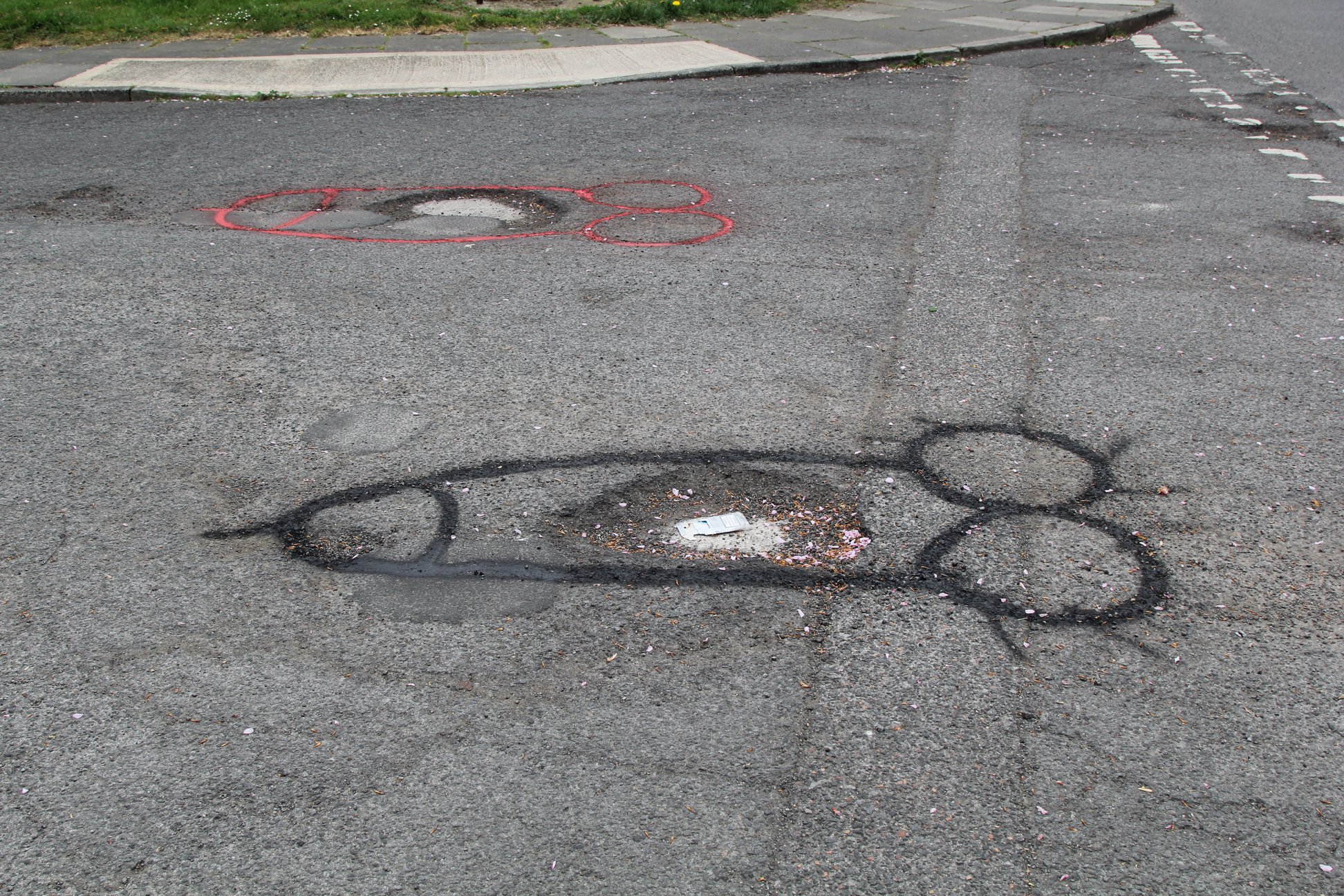▼英國米德斯堡(Middlesbrough)一位居民布萊德(Brad Nicholson)表示,他的居住區域路面有個坑窪,已經存在一年了,政府一直沒有來修。而不知道是什麼人,氣到在這個坑窪上畫了一根GG!