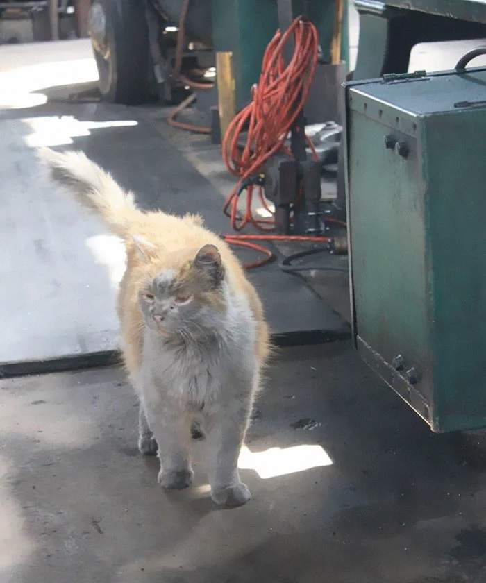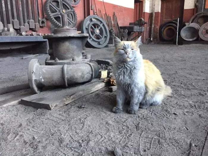 ▼在這裡度過了11個年頭的灰塵把這裡當成了唯一的家,每天在博物館里跑來跑去。這隻在煤炭中鑽來鑽去的薑黃色貓咪慢慢成了小灰貓,聰明的灰塵懂得用油污和灰塵隔絕寄生蟲和髒東西。