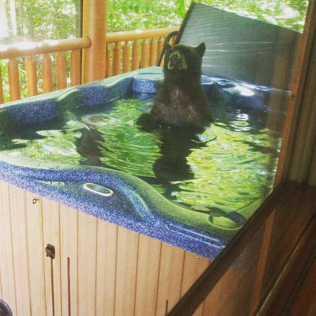 ▼但是過了一會就看到小熊爬進了外頭的熱水浴缸裡!