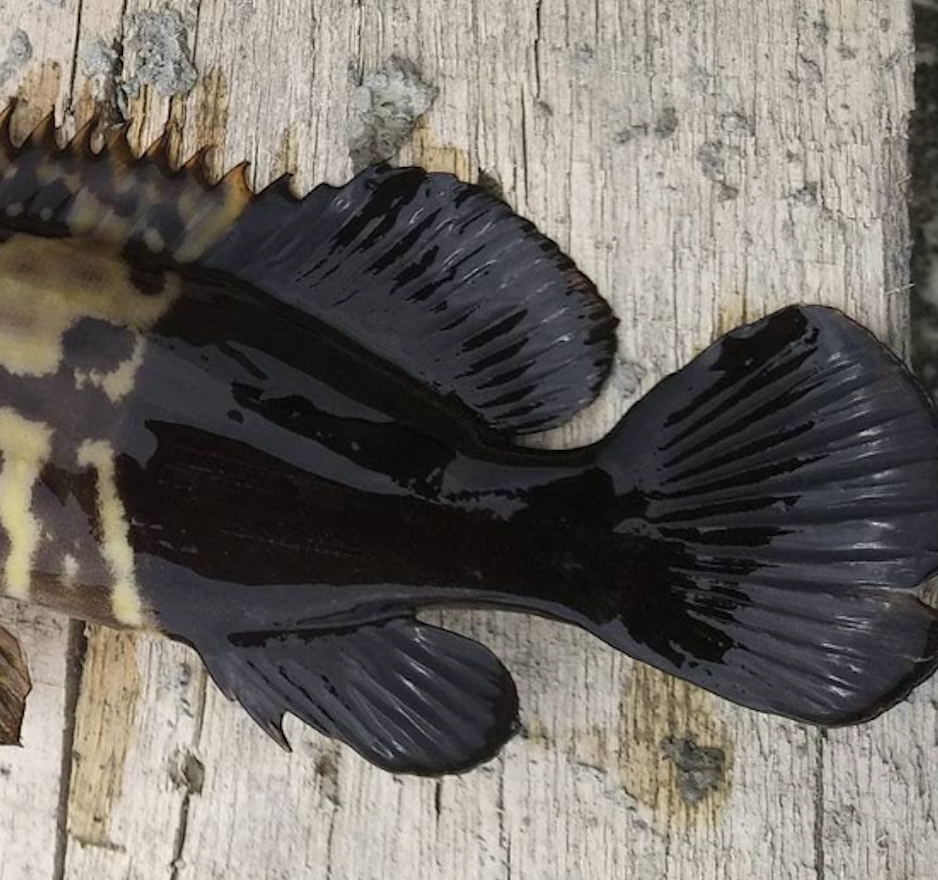 ▼「黑尾魚」的下半身是墨漆黑,陰陽雙色的模樣非常奇特,幾乎沒人看過長這樣的魚。網友也好奇猜測該條魚到底是什麼品種,有人說是普通石斑,但是也有人認為是孔雀魚。