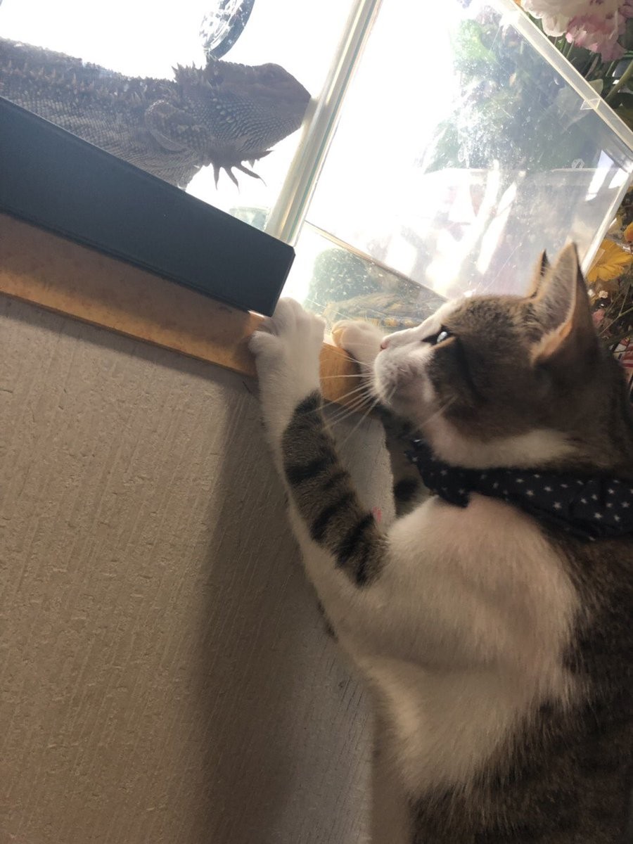 很多喜歡爬行寵物的人,都是從鬃獅蜥開始養起的。鬃獅蜥比較溫和,照顧起來也簡單,日本推特網友ASCOT家就有一隻鬃獅蜥。為了讓牠住得舒服一點,ASCOT準備了設備齊全的爬蟲箱。沒想到家中的貓咪也喜歡上了這個爬蟲箱,還偷偷溜了進去。