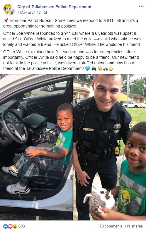 ▼位在佛羅里達州塔拉赫西警方在5/7臉書發文,表示收到一名6歲小男「911」電話,小男童在電話中提到自己很傷心,想向警察求助。警員懷特(Joe White)收到提報後立刻到小男童的家,才發現小男童在媽媽不知情的情況下打電話報警,原來男童和他的媽媽吵架了,小男童表示「我不開心,覺得孤獨,想要有一個朋友」,他還問警員懷特:「你可以當我的朋友嗎?」。