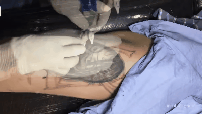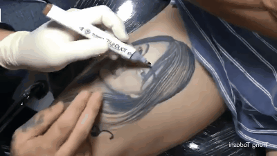 ▼刺青師傅先在原本的刺青上,畫上一些新圖案的輪廓。