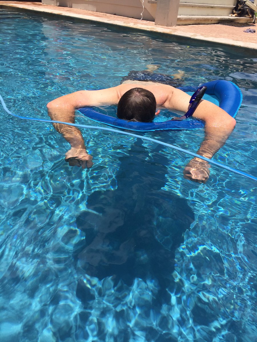 ▼為了在泳池中打瞌睡,爸爸買了一套浮潛裝置。