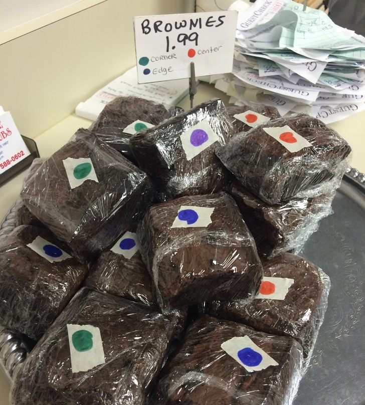 ▼這些布朗尼上面的貼紙代表了它們在烤盤上的位置:綠色是角落、紅色是中央、藍色是邊緣。