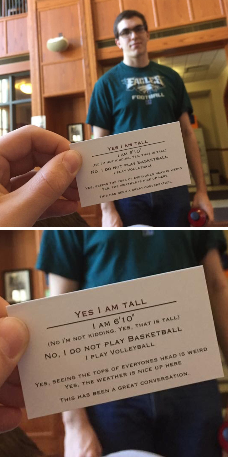 ▼我問了一句:「你有多高?」他遞給我一張名片,上面寫著「是的,我很高,我有208公分(我不是開玩笑的,真的有那麼高)。我不打籃球,我只打排球。是的,看到所有人的頭頂是很怪的事。是的,上面這裡的天氣不錯。很高興與你聊天。」