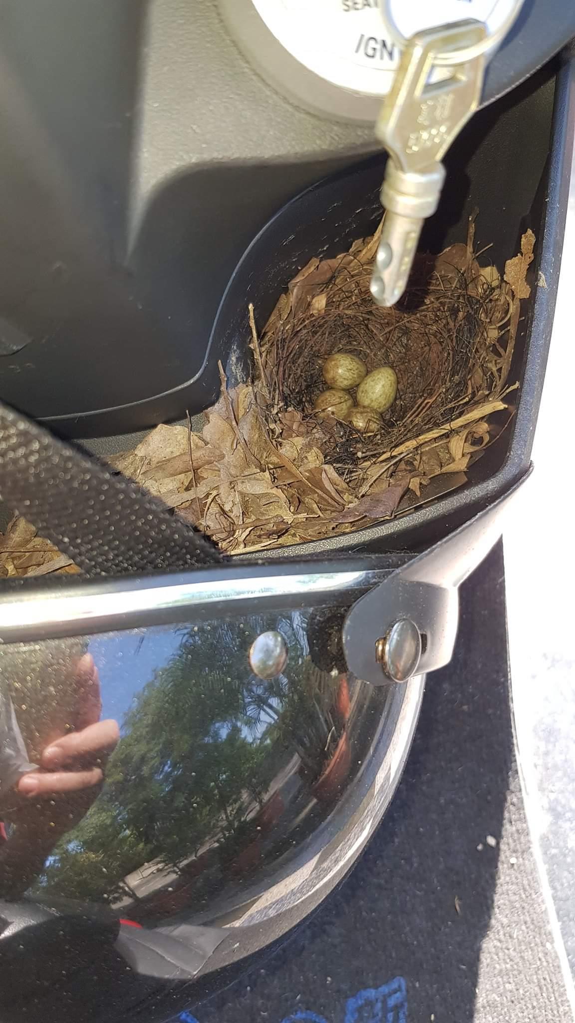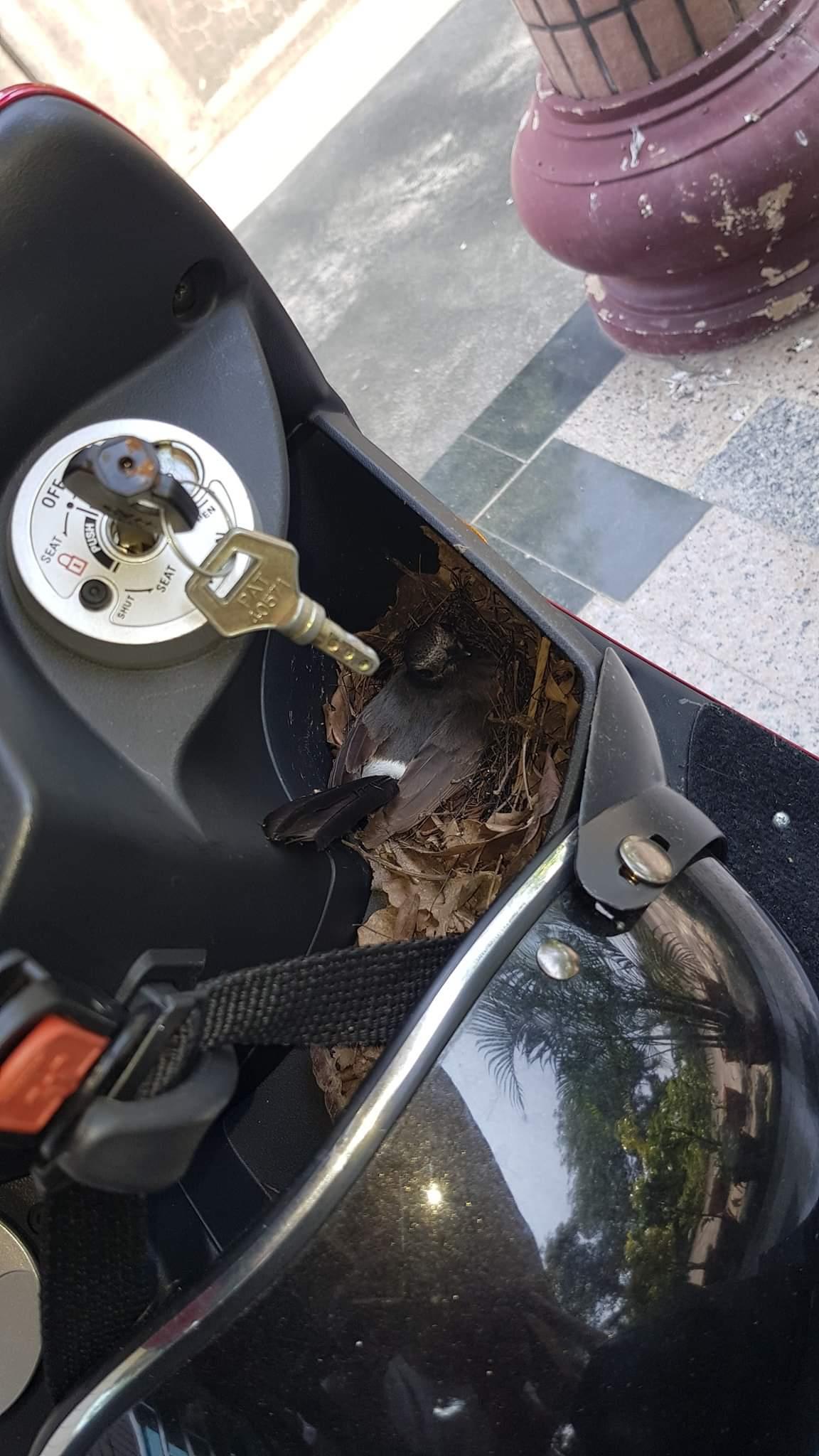 住家附近通常會看到鳥類在陽台或是騎樓築巢,但是在機車裡的應該沒看過吧?台南一名網友就在「爆怨公社」上傳照片,表示自己才一個多星期沒有騎機車,竟然在牽車時看到置物槽被鳥媽媽霸佔,而且還有蛋!