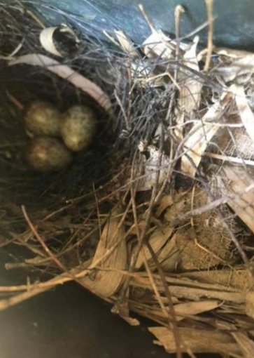 ▼原PO當下覺得太扯,整個傻眼,但是並沒有去驚擾對方。從照片中可以看見鳥媽媽在機車置物槽用枯枝、樹葉築巢,而且還下了四顆蛋~再加上機車停放位置剛剛好可以遮蔽陽光,置物槽又有安全帽遮擋,所以對鳥媽媽來說是一個非常幫的育嬰位置。