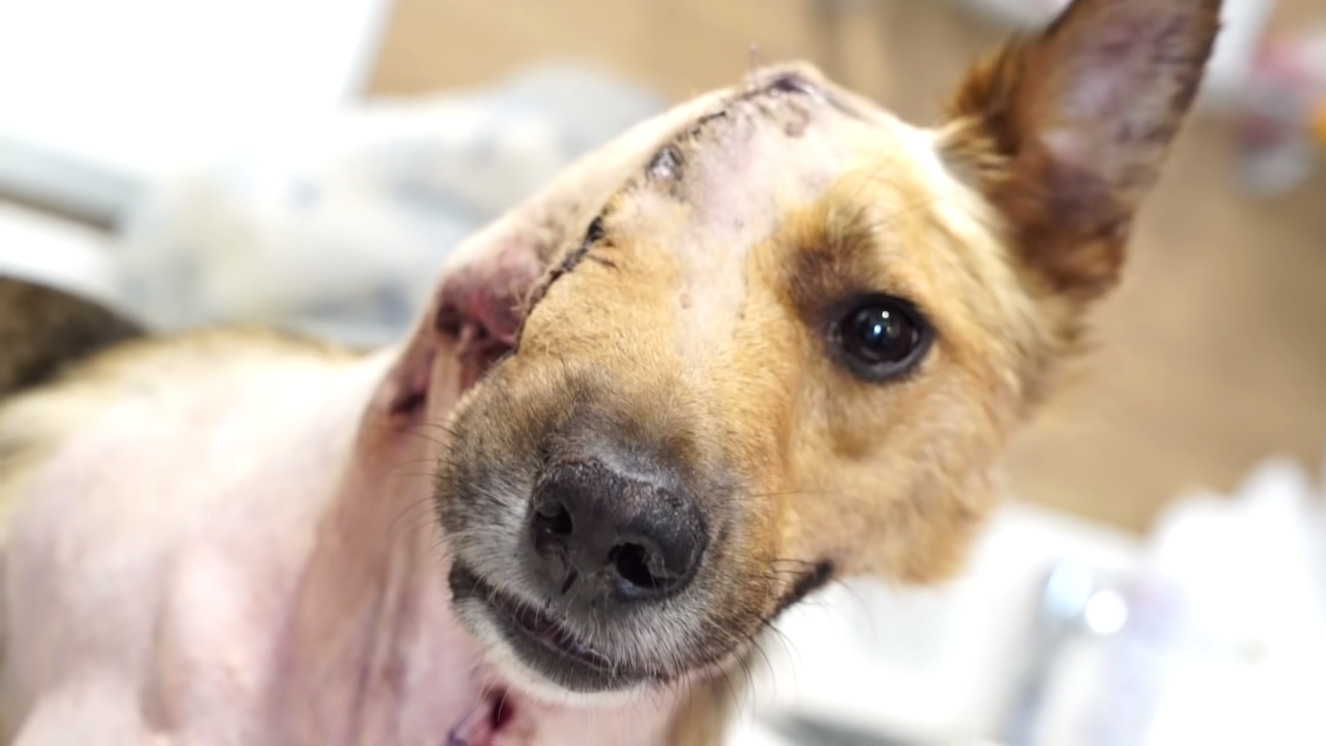 當牠一轉頭,看到的小孩一定會嚇哭。這隻只剩下半邊臉的狗狗名字叫Sky,幾年前還在流浪街頭的Sky,被人用鐵鍬重擊,砍掉半邊臉,導致右眼、右耳以及顴弓全部掉落,右臉垂掛廢棄組織,甚至有牙齒外露,受創的Sky找了一個地方躲起來,被一名路人發現,當時Sky空洞的眼窩全都是毛髮和雜草,模樣非常嚇人。