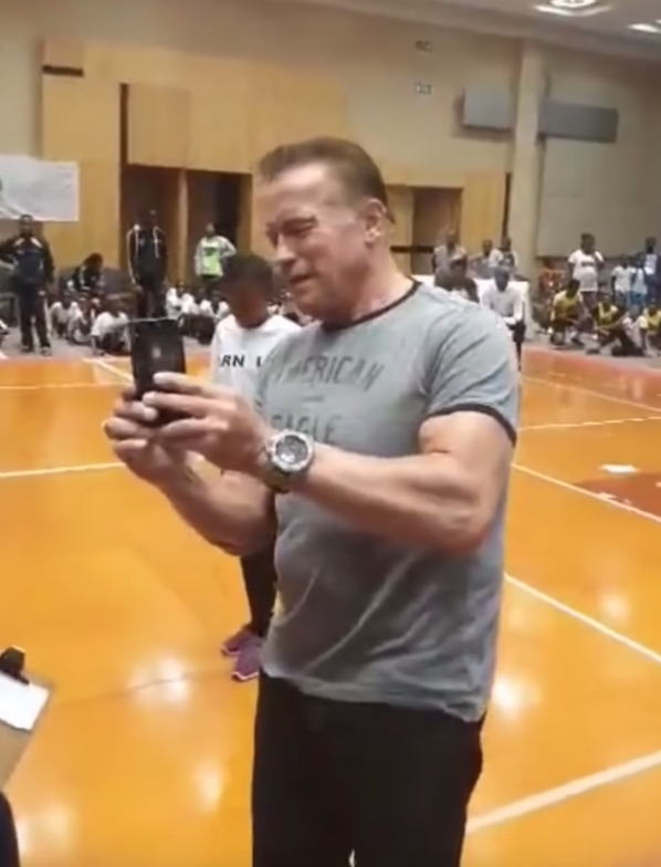 ▼當時阿諾錄影後,打算將手機交給別人時就遭到了飛踢!