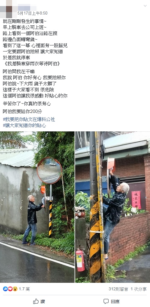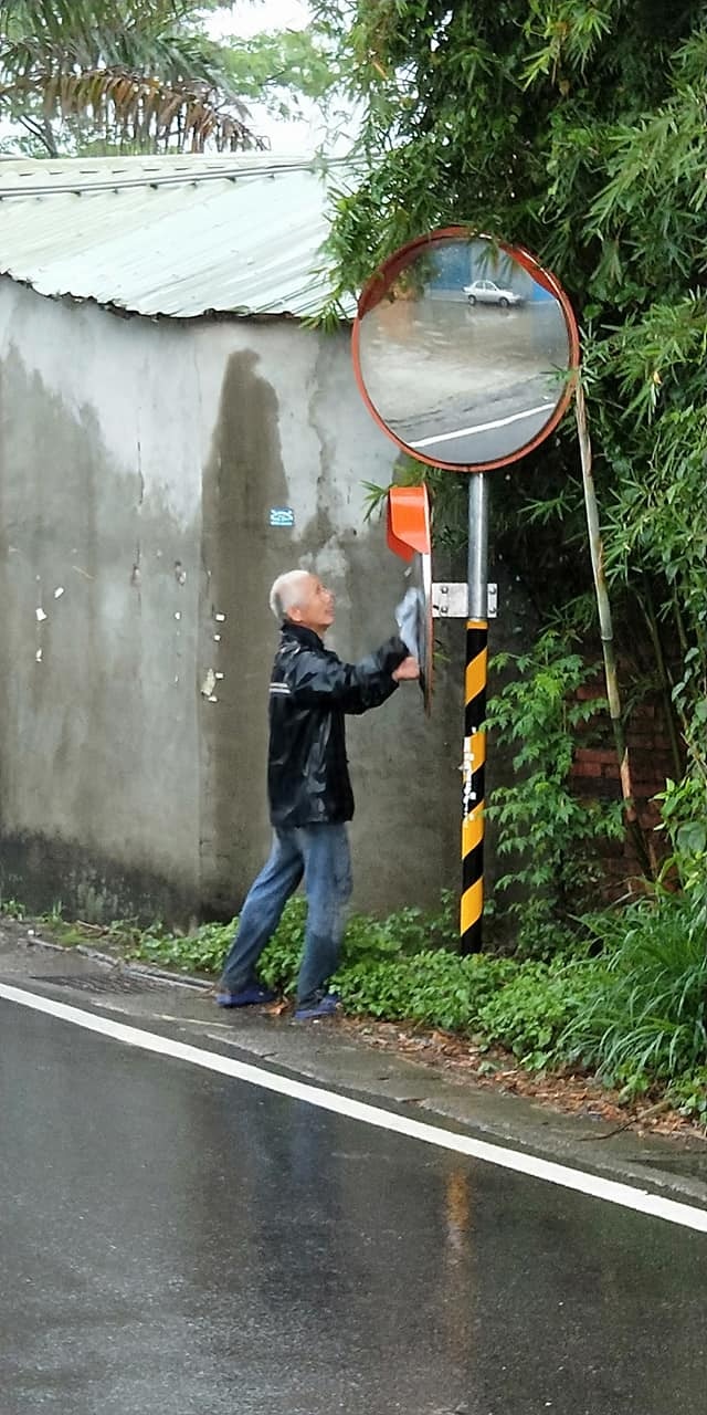 2019年05月20日常聽人說「台灣最美麗的風景是人」,近年來雖然有許多事情鬧得滿城風雨、紛紛擾擾,但仍有許多人為了讓台灣更好而默默付出。日前就有網友分享,他看到一位阿伯為了用路人的安全著想,沿著馬路冒雨擦路邊的廣角照路鏡,讓人十分動容。