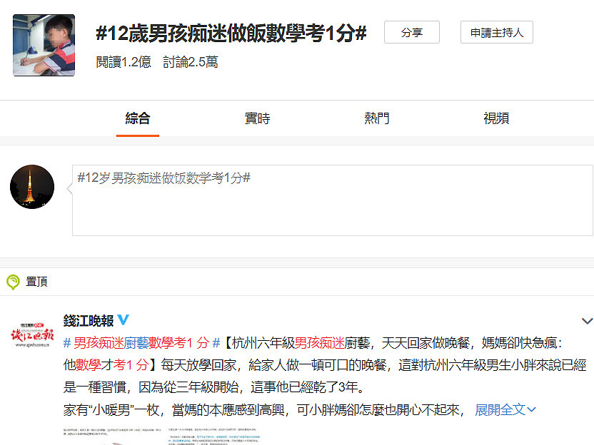 2019年05月21日所謂「職業不分貴賤」,有時候即使唸書成績不好,可是能夠在自己喜歡的事業上發光發熱,也是一件令人欣慰的事。中國杭州就有一個就讀小六的12歲男童,從3年前就開始迷上了下廚,每天下課回家後都會到廚房為全家人煮一頓好吃的晚餐,不過他的母親卻非常擔憂,在網路上表示「他不愛念書,回家不寫作業就搞做菜,數學甚至只考1分,怎麼辦?」引來了許多網友的熱議。
