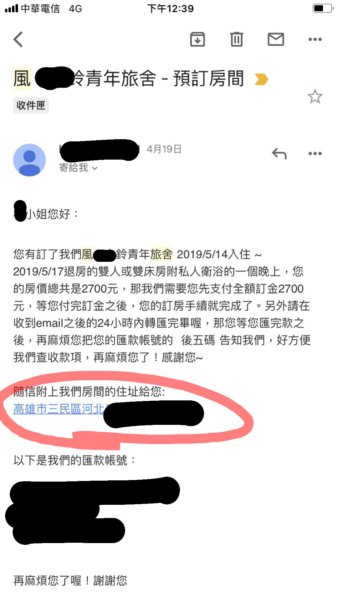 2019年05月21日4天3夜之旅竟然住到凶宅!「Dcard」一名女網友PO圖控訴在高雄訂了一家評價頗高的民宿,但是負責人過後卻傳來了一個「新裝潢」的地點,而她也在查過地圖確認有這個地方後,就沒有多加理會…沒想到噩夢就這樣開始了。