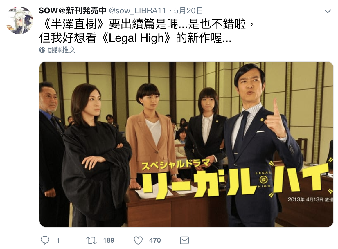 ▼對此,粉絲們除了感到開心外,希望堺雅人另一部作品《王牌大律師Legal High》出續作的呼聲也非常高。
