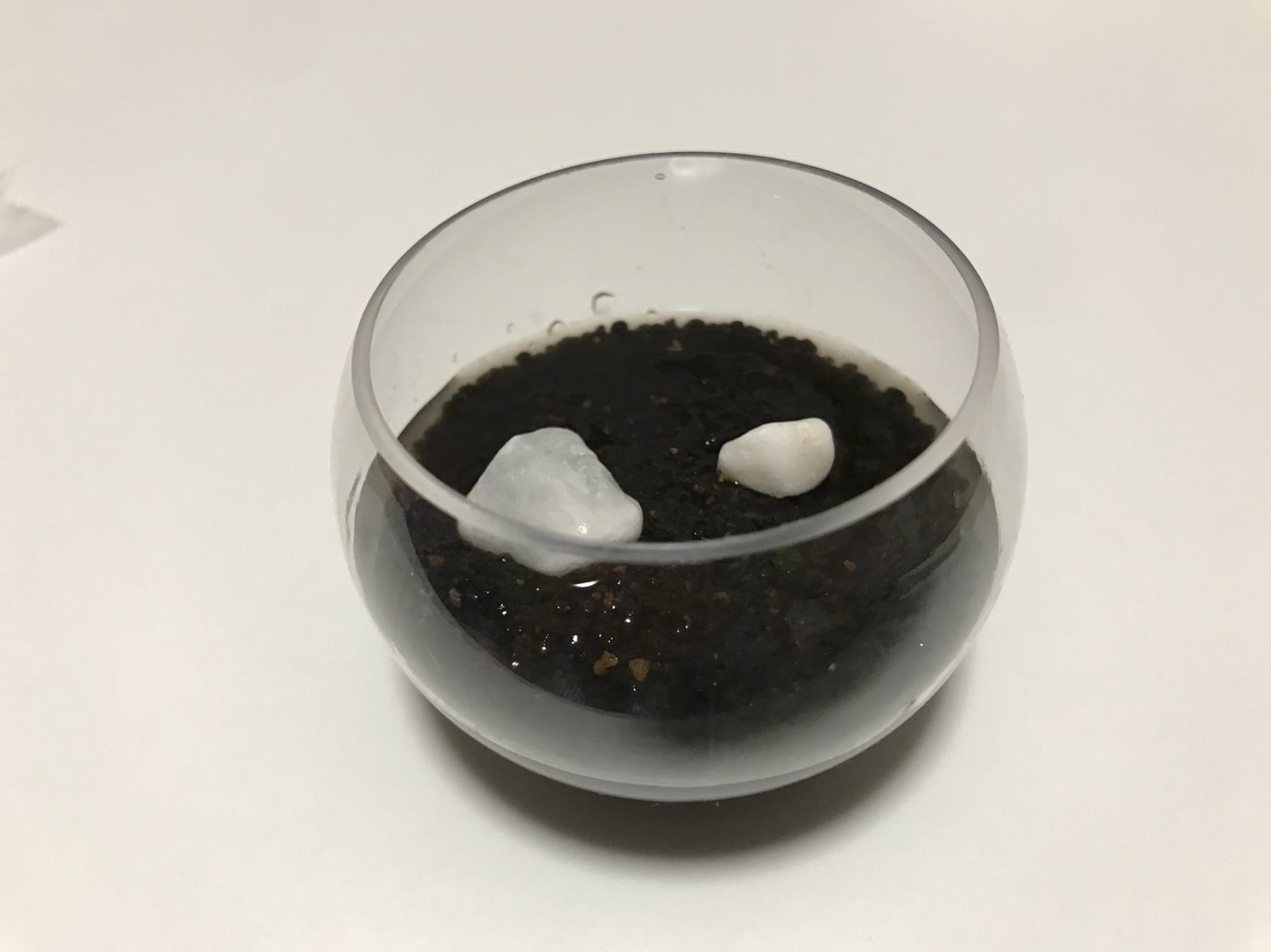 ▼依照步驟把介質、造景石、種子、水都加入之後,等待水草發芽。
