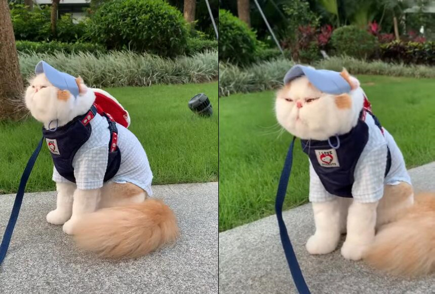 ▼臉書粉專「加藤軍台灣粉絲團2.0」轉貼了這則影片,影片中一隻橘白色的肉肉臉喵穿著一身水藍色的格子休閒裝,還背著小背包戴著帽子,整潔的裝束絕對是整條街上最靚的貓!