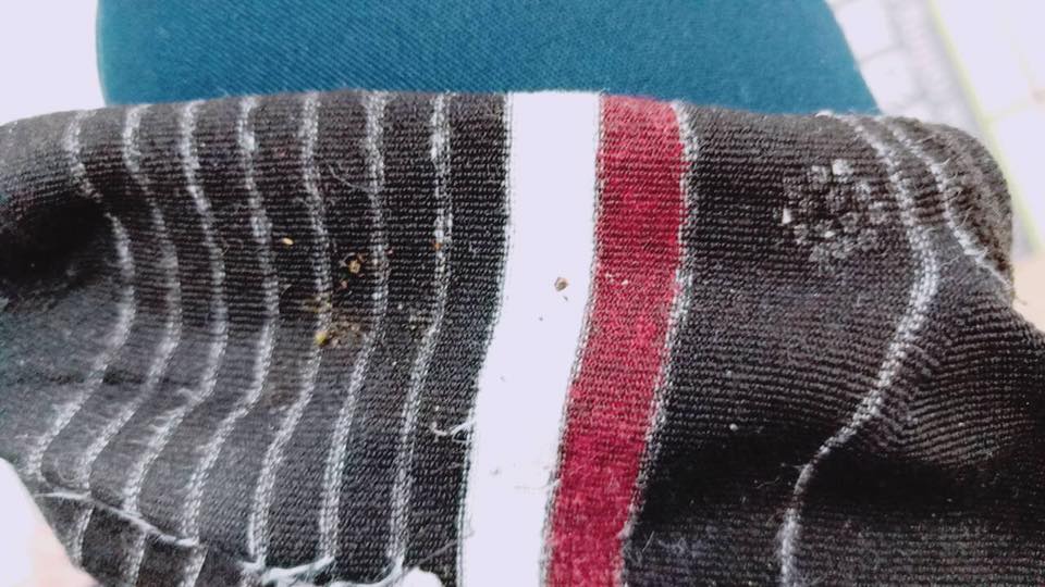 ▼原po在臉書社團《爆怨公社》中po文表示,「如果我說我妹很智障!把荔枝椿象穿在腳上,然後上班四小時才發現,是不是該說她沒神經?」從照片中可以看到,10幾顆蟲卵都附在襪子內側,而且有些還有孵化的現象!