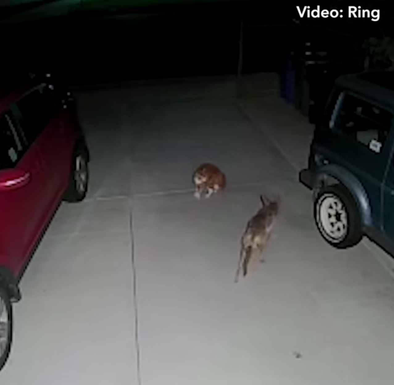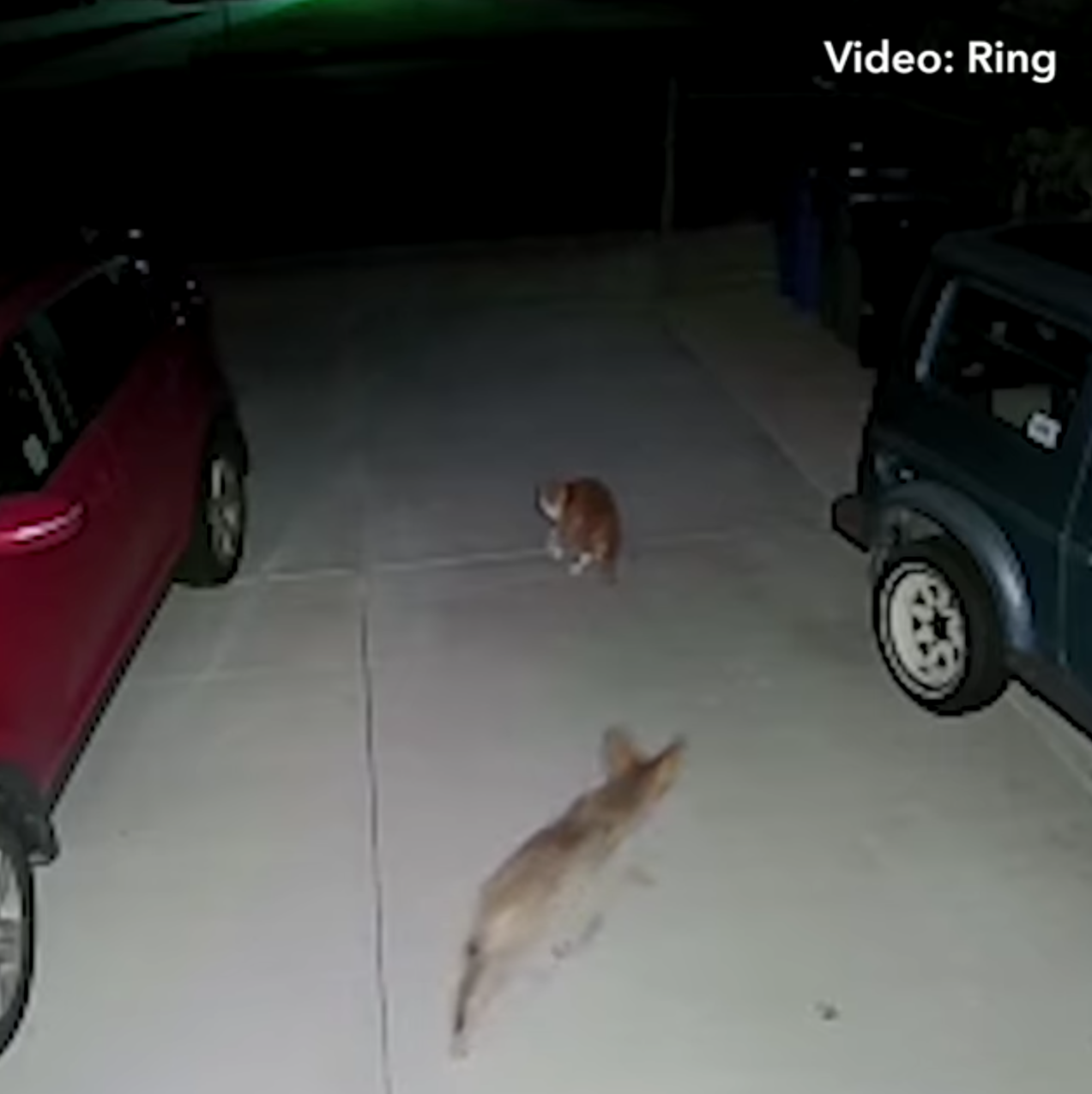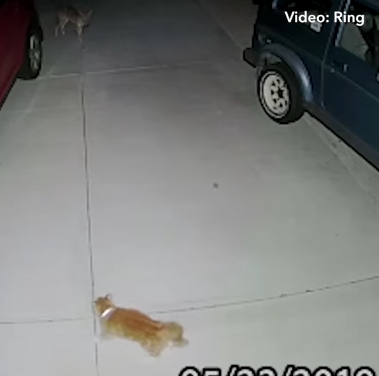 2019年06月01日美國一隻16歲橘貓寶刀未老!居住在洛杉磯的Beth Hayes在半夜突然被移動探測器驚喜,一開始還以為是是有賊在門口,沒想到打開手機竟然驚見愛貓被2匹飢腸轆轆的郊狼盯上!但是,下一秒她竟然看到愛貓發威的畫面!