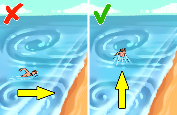 如果你發現自己深陷暗流之中,那麼努力朝著岸邊游是沒有用的,只會浪費自己的體力。這時應順著暗流流向,直到游出這個強力的水流後,再游回岸邊。