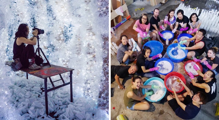 ▼志願者花費了一天半的時間收集了18000個塑膠杯,並用28小時將它們清理乾淨。他們將這些塑膠杯打造成了一個水晶洞穴,在這裡可以拍出閃亮的照片,並且喚醒全世界人的環保意識。