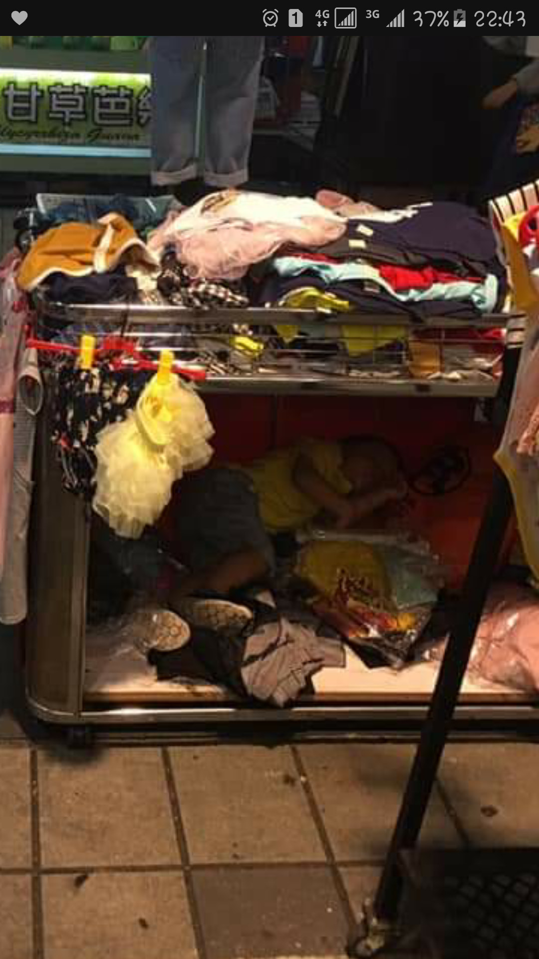 ▼但很快就有眼尖的網友發現,竟然有小孩子睡在賣衣服的攤子下面!