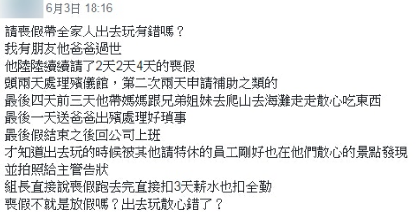 2019年06月06日請喪假帶家人去散心,錯了嗎?「爆怨公社」一名網友超生氣表示自己的朋友就遇到抓耙子和管很多的主管,朋友父親離開了這個世界,他前前後後請了8天喪假處理後事和照顧家人,沒想到主管竟然直接扣朋友全勤和3天薪水!
