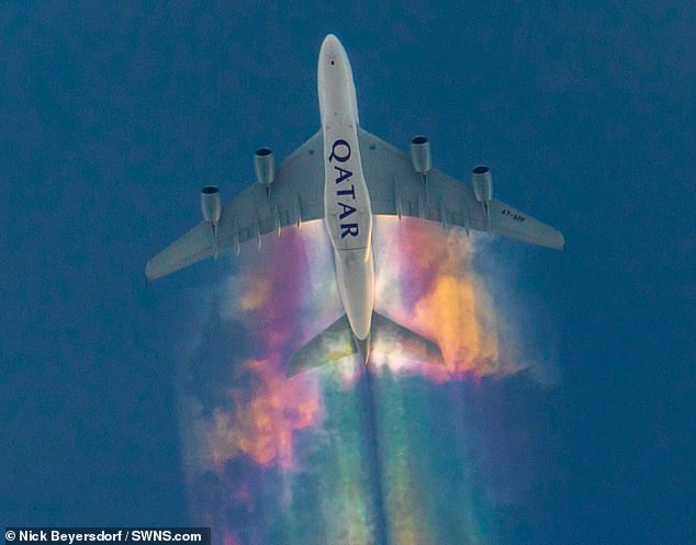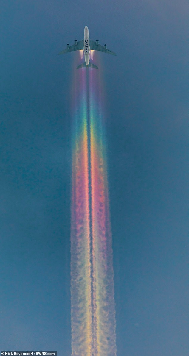 ▼從攝影師尼克(Nick Beyersdorf)所拍攝的照片可以看到,這架飛機是屬於卡達爾航空(Qatar Airways)的。這些照片都是尼克在家裡的後院中無意中拍下來的,當時這架客機的機翼在天空中劃出了一道漂亮的彩虹軌跡,照亮了整個天空!已經連續拍攝飛機5年的尼克認為這是他今年所拍到的最佳照片,「我不覺得有其他作品可以勝過它。」