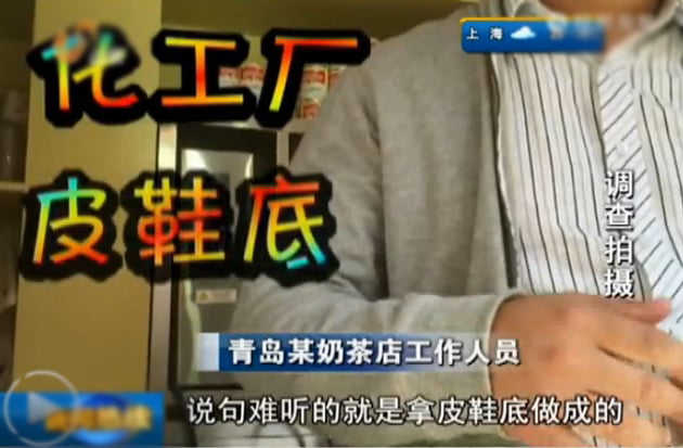 ▼2015年,中國山東電視台透更曾揭露,一些「假珍珠」可能是皮鞋底和舊輪胎做的。匿名的奶茶店經理透露,這些珍珠都是在化工廠生產的,而材料中就含有皮鞋和舊輪胎的廢料。