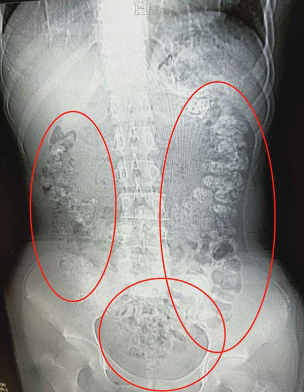 ▼根據中國《澎湃新聞》的報導,這名14歲少女於5月28日在父母陪同下來到浙江諸暨市人民醫院急診。原來她已經連續5天都腹痛不已,不僅沒有排便更吃不下東西,當時醫師見她肚子鼓鼓的,於是安排了她做腹部 CT,結果發現患者的胃部、橫結腸、升結腸、降結腸、乙狀結腸一直到肛門,都佈滿了密密麻麻的顆粒陰影!